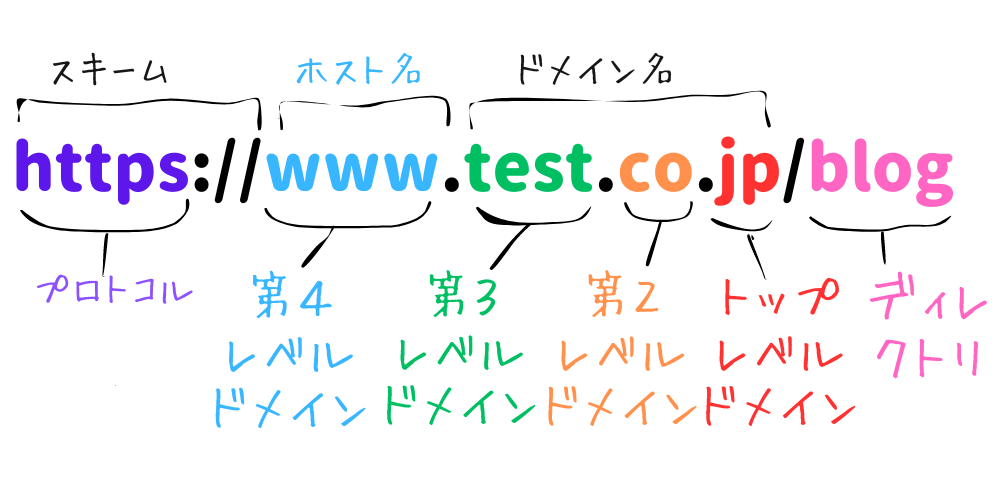 例えば、www.test.co.jp/blogでは、jpがトップレベルドメイン(TLD)、coが第2レベルドメイン、testが第3レベルドメイン、wwwが第4ドメインです。